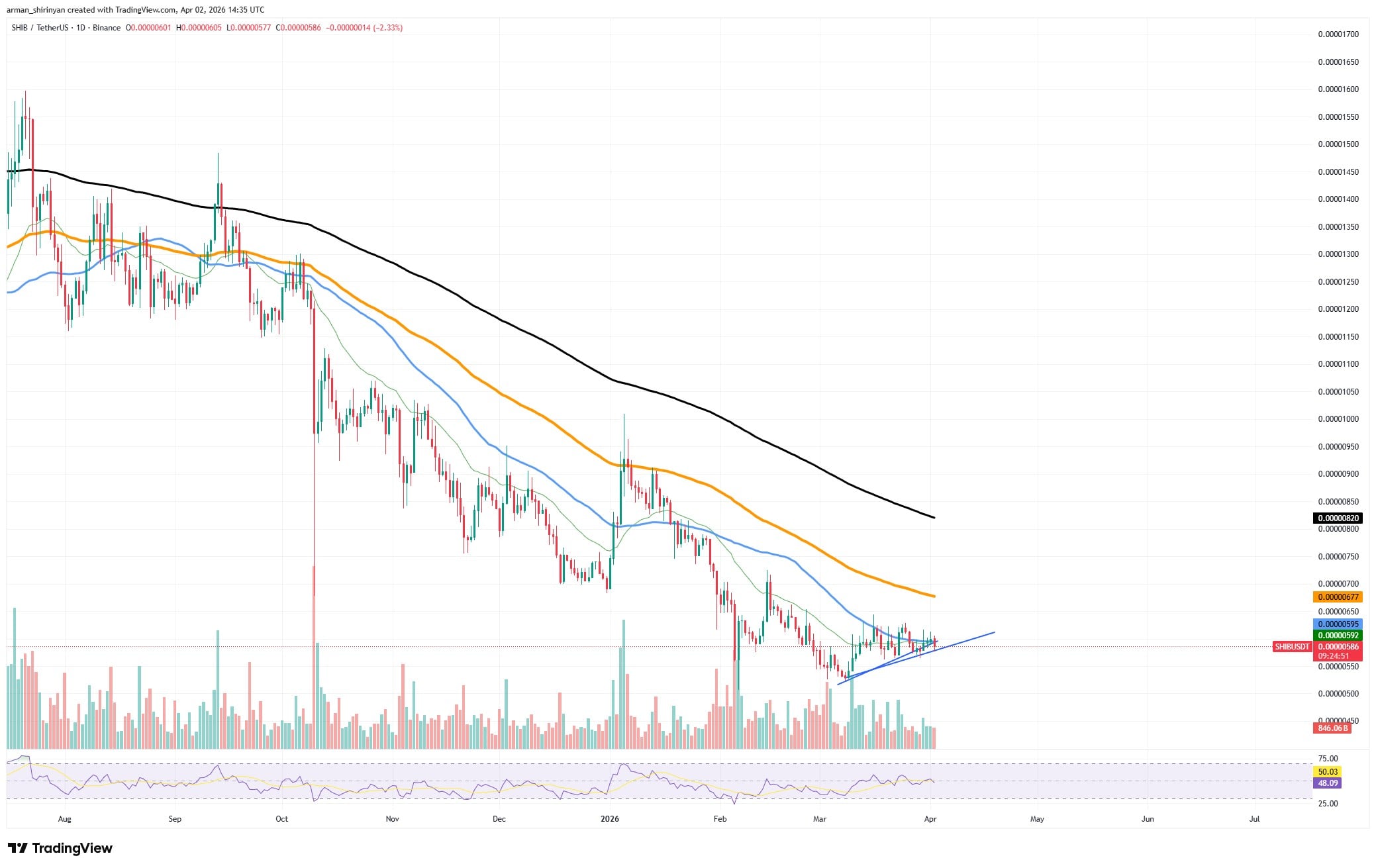 The overall trend is still clearly negative. The 50, 100 and 200-day levels are among the major moving averages that $SHIB is still trading below. All of these levels are trending lower. This alignment is a result of persistent selling pressure and insufficient long-term accumulation.