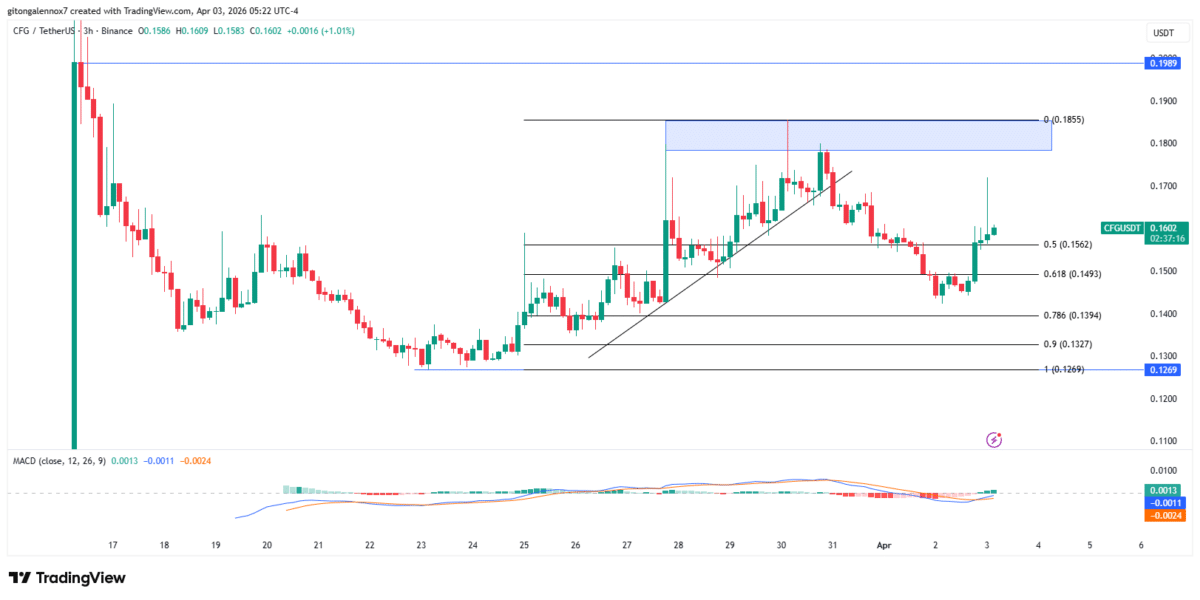Holding through the premium zone, which is above the 0.5 Fib level, the altcoin increases the potential to hit $0.1857. However, this zone has sparked bearish reversals three times as $CFG makes the fourth attempt.