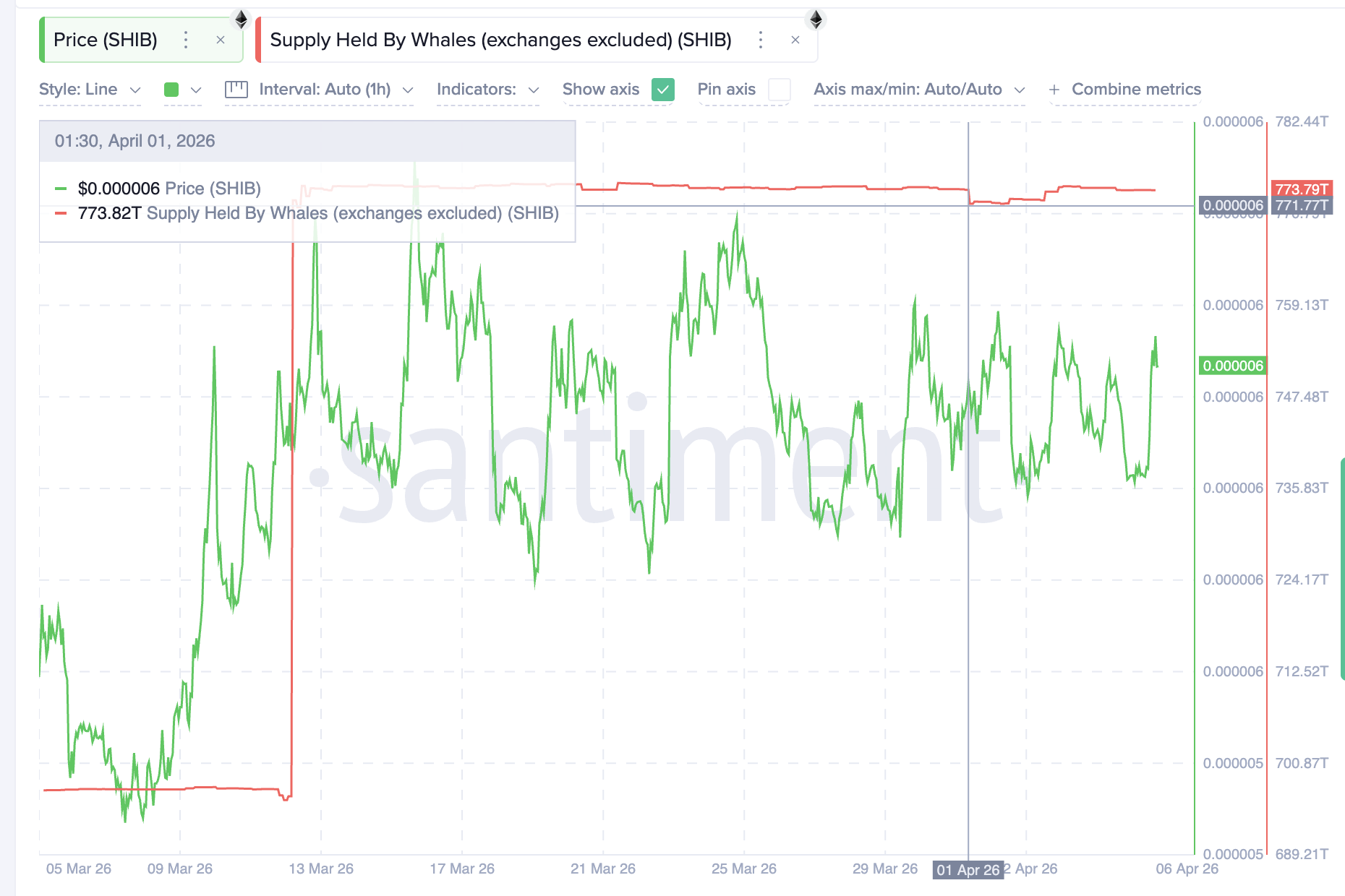 Shiba Inu ($SHIB) trades at $0.00000602, up 11% over the past 30 days but still down 13% year-to-date. Whale wallets have been gradually increasing their holdings since a sharp accumulation phase began around March 13, when balances surged to above 771 trillion $SHIB. Since April 1, whales have added another 2.02 trillion tokens worth approximately $12.16 million, pushing total holdings to 773.79 trillion.