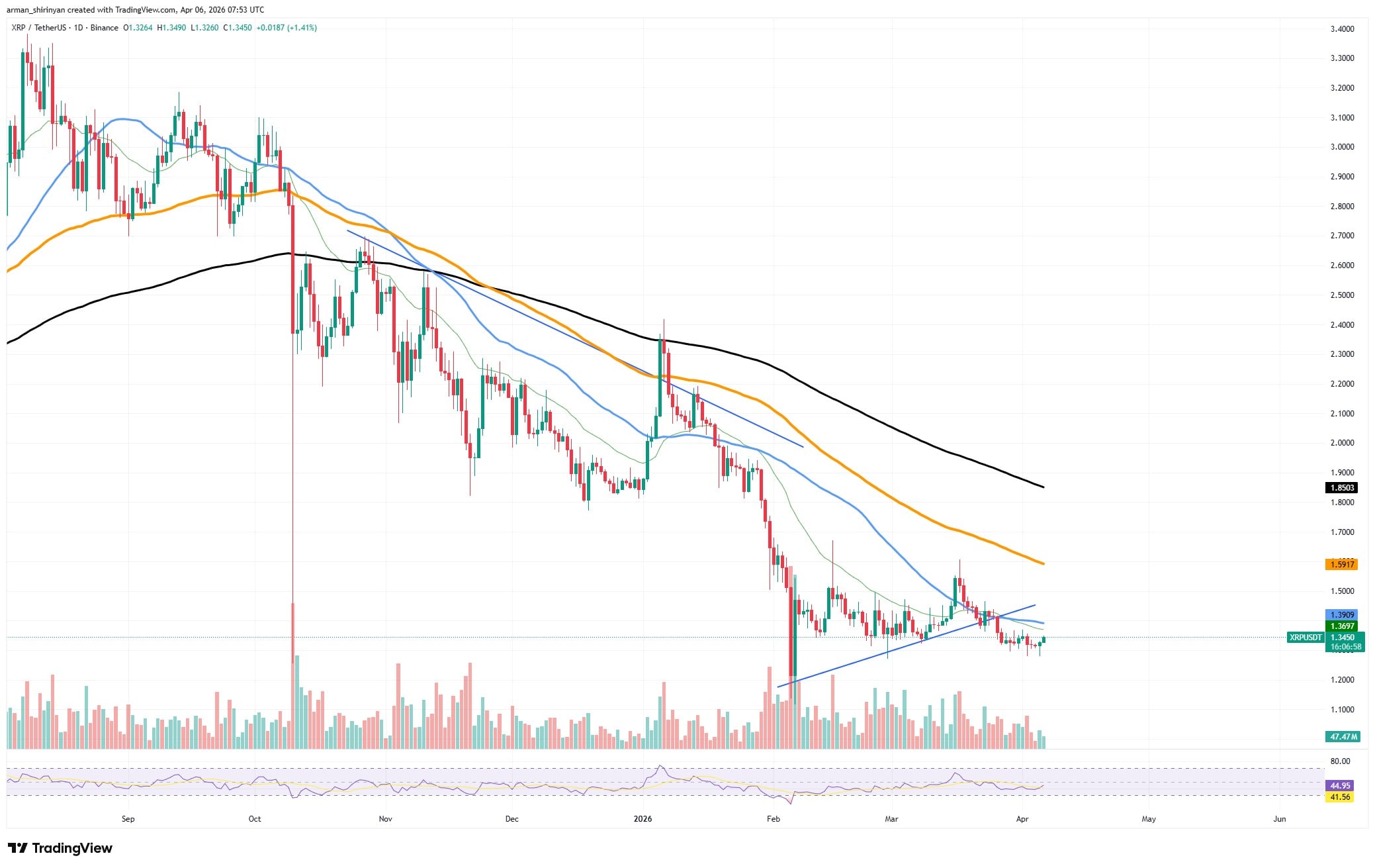 The way capital enters the market is structurally inefficient. $XRP is still in a downward trend on the price chart. Sellers continue to be in control, as evidenced by lower highs, rejection from descending moving averages and a recent breakdown from a short-term ascending support trendline.