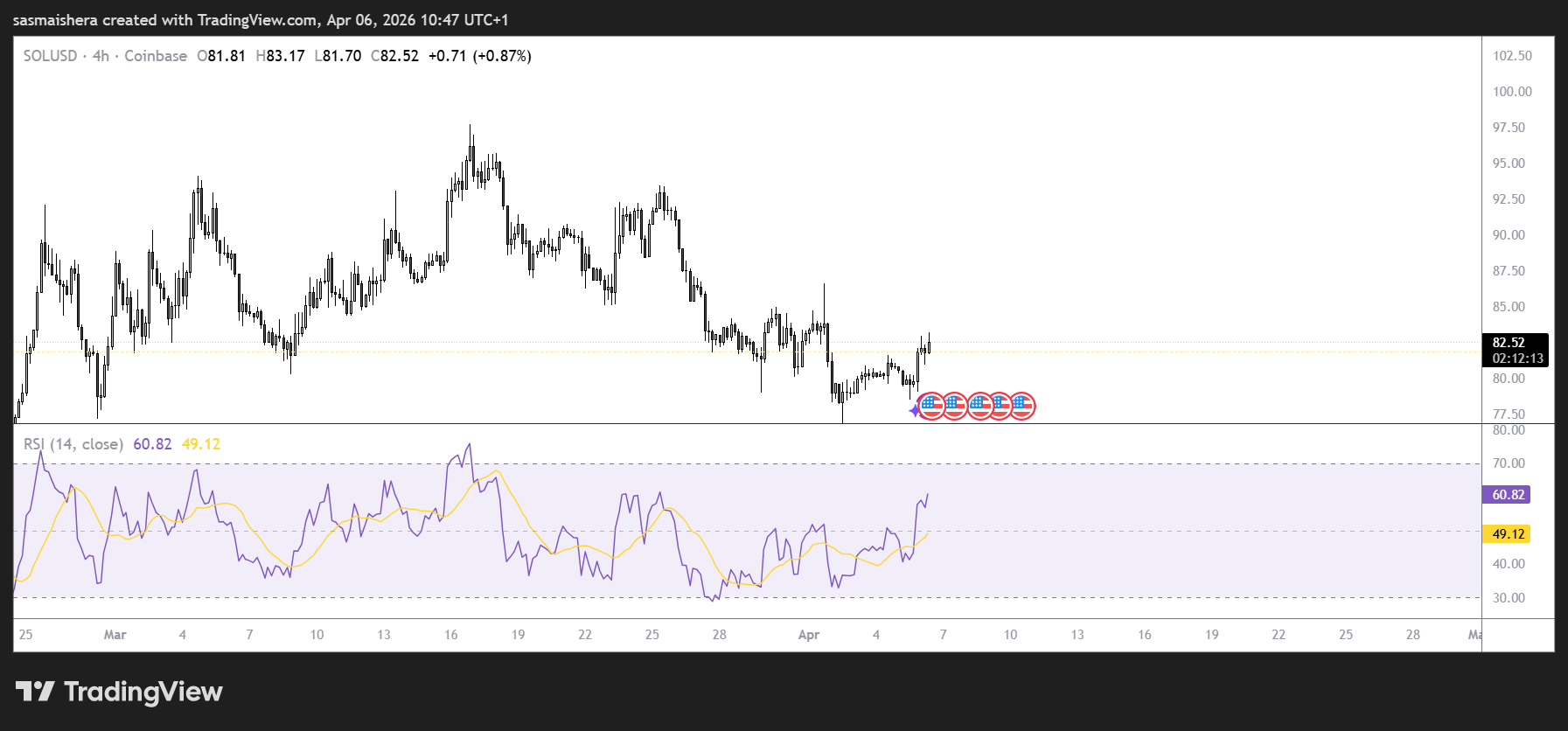The $SOL/USD 4-hour chart is bullish and inefficient, with the coin up by nearly 4% in the last 24 hours. At press time, $SOL is trading at $82.50 per coin.
