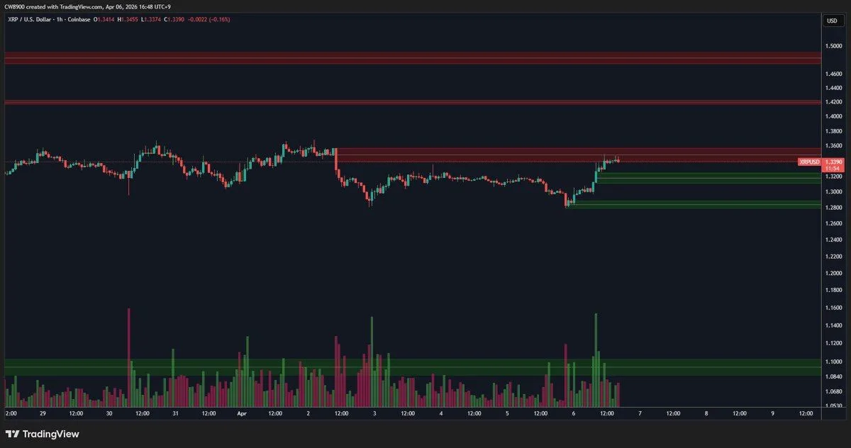 The recent recovery began after $XRP fell toward the $1.28 area and then reversed higher. According to crypto analyst CW, the $XRP price has reclaimed the local base between $1.30 and $1.32 before moving back into the red supply zone near $1.34 to $1.355. This area remains the first barrier on the chart and now defines the near-term setup.