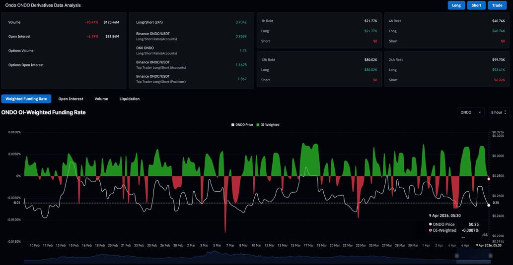 The leverage market anticipates further declines in $ONDO amid incredulity over the US-Iran ceasefire, weighing on the broader cryptocurrency market. According to CoinGlass, the $ONDO futures recorded a total liquidation of $99,730 over the last 24 hours, led by $93,410 in long liquidations, indicating an intense sell-side pressure in the spot market.