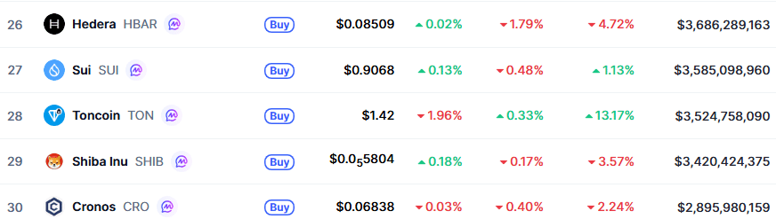 While $SHIB maintains a modest lead over Cronos, several projects above it remain within striking distance. For instance, Toncoin holds 28th place with a market cap of $3.52 billion. Similarly, Sui ranks 27th with a valuation of $3.58 billion, while Hedera occupies 26th place at approximately $3.68 billion.