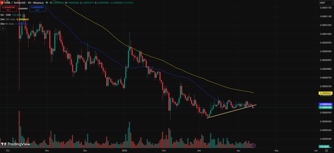 On the daily timeframe, Shiba Inu broke below an ascending trendline support, bringing fresh pressure on its price. This dynamic demand zone has cushioned prices since March 8, when $SHIB reached an intraday low of $0.00000523.