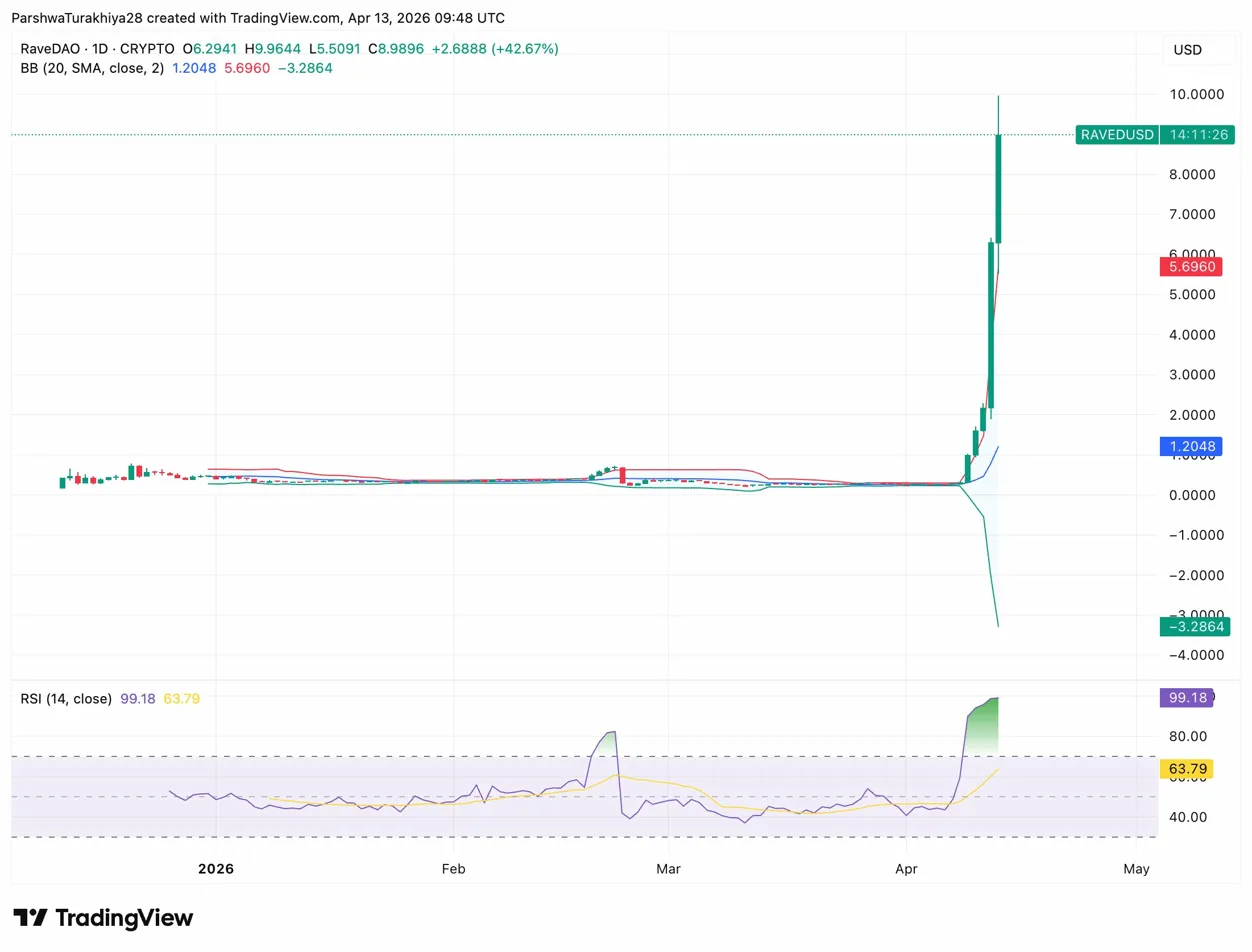 The daily chart answers the question bluntly. $RAVE traded flat near $0.20 to $0.30 from January through early April with the Bollinger Bands compressed tight, upper band at $5.69, middle at $1.20, lower at -$3.28. The April spike blew those bands wide open, with price now sitting at $8.98, nearly $3.30 above the upper band.