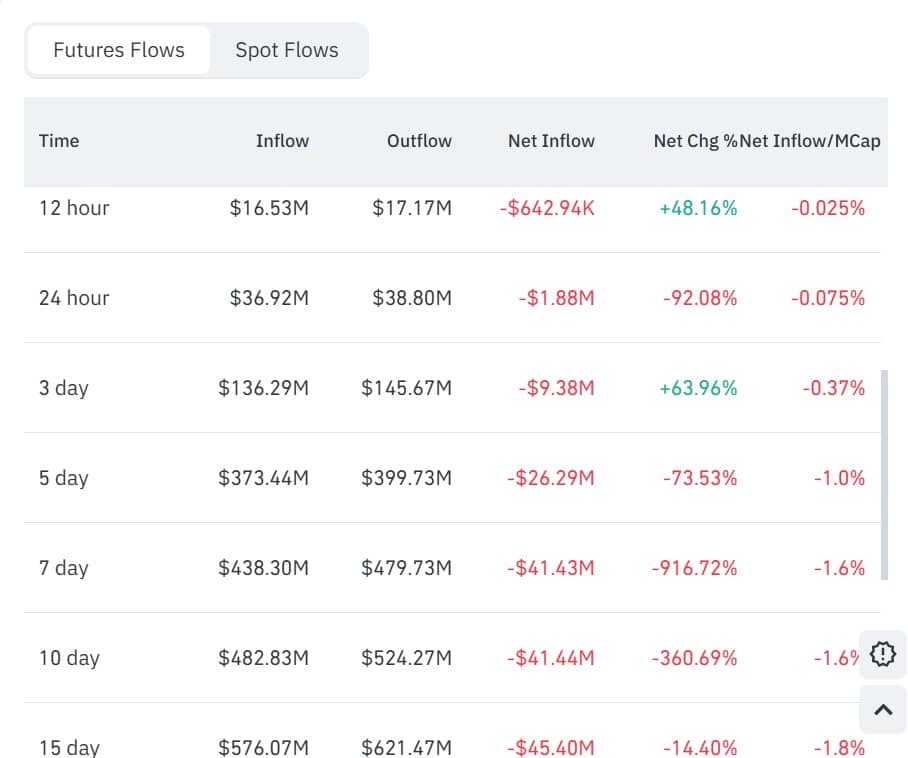 Futures data showed $479.89 million in outflows against $438.46 million in inflows. This pushed Futures Netflow to -$41.4 million, signaling sustained selling pressure.