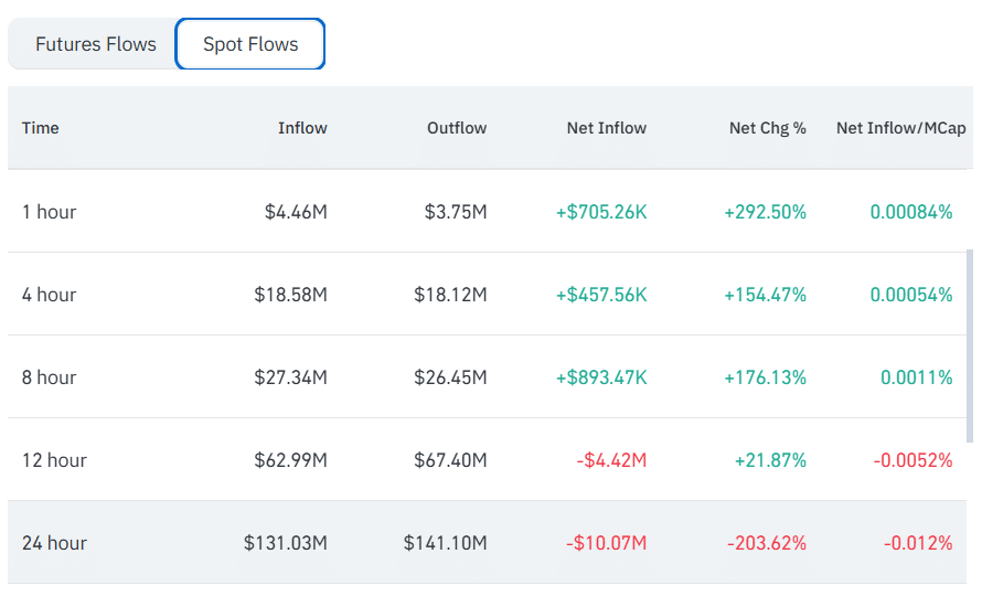 While futures flows have continued to see positive trends, spot market data follows the opposite direction. The 8-hour timeframe shows inflows at $27.34 million against $26.45 million in outflows, producing a +$893.47K net inflow.