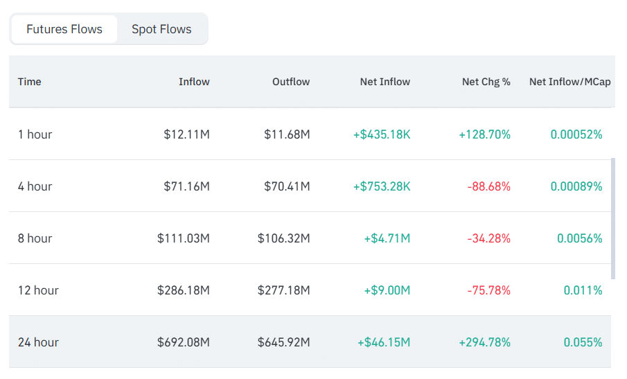 Over shorter timeframes, the 4-hour data shows $71.16 million, a net inflow of +$753.28K. In 8 hours, inflows reached $111.03 million against $106.32 million in outflows, leading to a +$4.71 million net inflow. Over the 12-hour window, inflows rose to $286.18 million compared to $277.18 million in outflows.