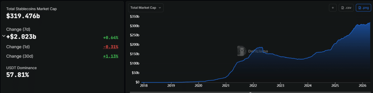 Stablecoin liquidity sat in quiet tension, as supply reached $319.5 billion with modest weekly growth of +0.65% as of writing, reflecting restrained issuance. At the same time, monthly expansion of +1.13% signaled limited capital inflow despite a $2.5–$2.7 trillion market.