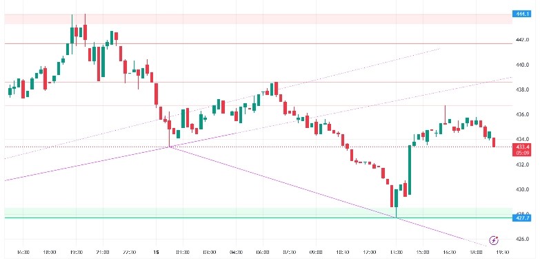 The 15-minute price chart for Bitcoin Cash reveals a market that is attempting to forge a new support floor. Following a sharp distribution phase that saw the price dip to a structural basement near $427.7 (indicated by the green support line), the asset has executed a steady recovery. Currently priced at $433.4, the token is navigating a period of “low-velocity” consolidation.