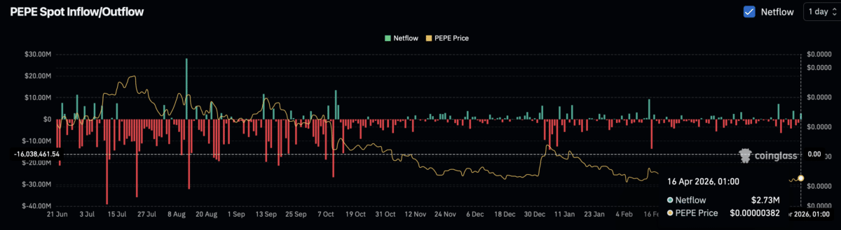 Data from CoinMarketCap shows that more than 2,800 new addresses have accumulated $PEPE since the start of April, marking one of the strongest expansions in its holder base lately. The total number of holders stood near 514,980 at press time.