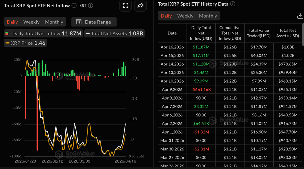 $XRP spot Exchange-Traded Funds (ETFs) also uphold a positive outlook, evidenced by the $11.87 million in inflows on Thursday. SoSoValue data shows that US-listed $XRP spot ETFs have maintained a bullish streak for five consecutive days, bringing cumulative inflows to $1.26 billion and net assets under management to $1.08 billion.