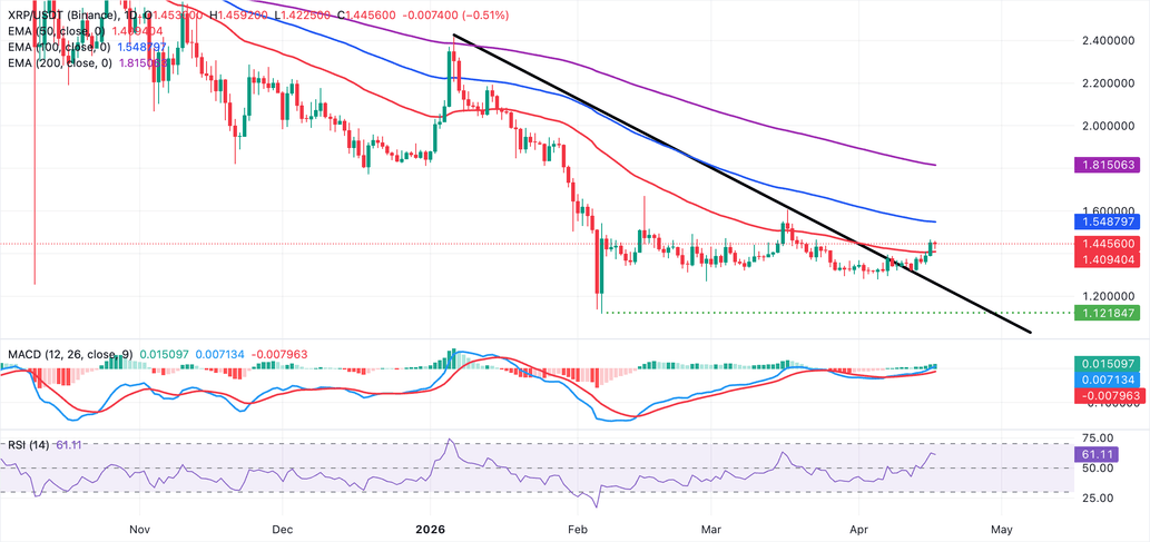 Ripple ($XRP) is trading at $1.44 at the time of writing on Friday, its upside seemingly capped by its weekly peak around $1.47. Still, the overall tone remains bullish as the remittance token holds above key support levels at $1.40 and $1.30.