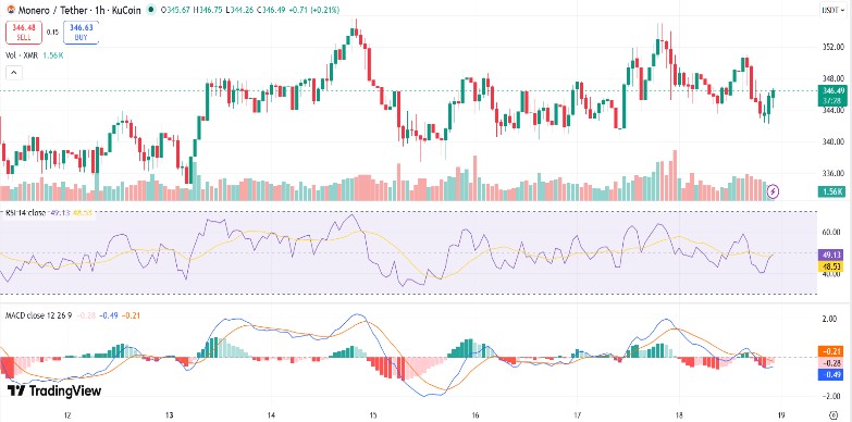 In the current consolidation pattern, there are major support and resistance levels for Monero. The primary support level is holding steady around $340. This is working as a major level that buyers have defended multiple times during the past week of range-bound trading. The second biggest zone is sitting around $328 and $330, where the price might find a reliable stability during short-term selling waves.