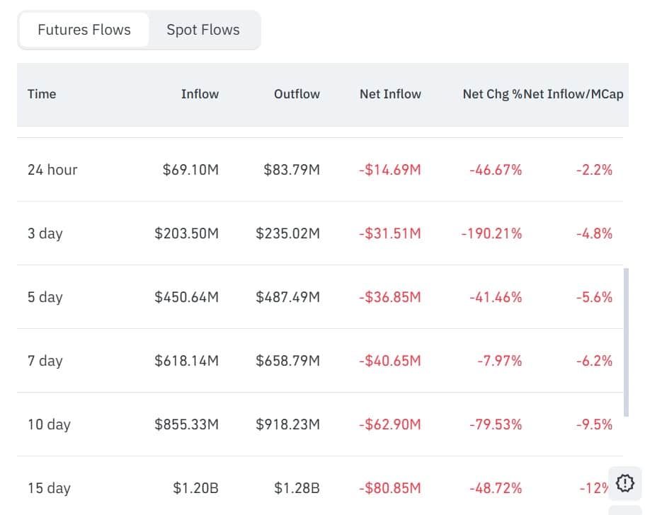 Over the past seven days, for example, $658.7 million flowed out of futures compared to $618 million in inflows. The trend is even stronger on longer timeframes, with over $1.2 billion leaving in the past 2 weeks.