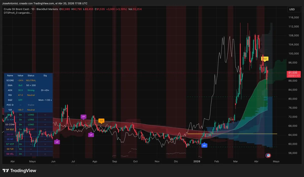 On Myriad—the prediction platform launched by Decrypt's parent company Dastan—the crude oil direction market is pricing a 63.2% chance that Brent pumps to $120, versus 36.8% for a dump to $55.