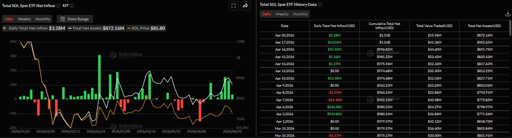 Institutional demand for $SOL started the week on a positive note. SoSoValue data shows that spot Solana ETFs recorded inflows of $3.28 million on Monday, following $35.17 million last week and marking the fifth consecutive day of inflows. If this inflow continues and intensifies, $SOL could see an upside move ahead.