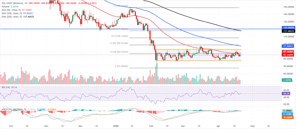 Solana is trading at $85.27 on Tuesday, up over 2% from the previous day. $SOL nears the key 50-day Exponential Moving Average (EMA) at $87.10, where a close above suggests a bullish move.