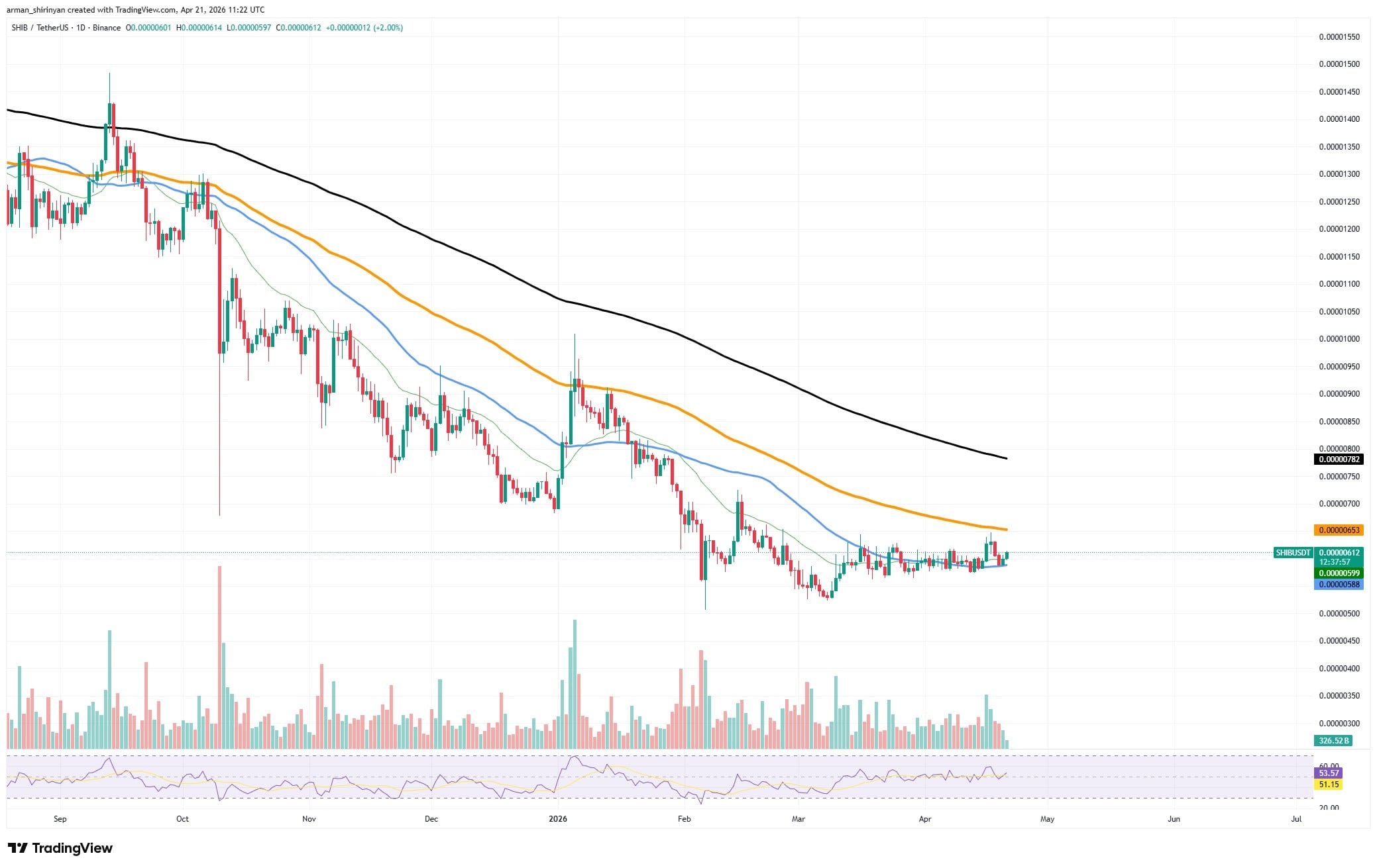 $SHIB is still recovering structurally from a protracted decline. After months of steady decline, price action is still comparatively compressed near local lows, trading in a small range. Because the asset is still below important moving averages, the overall trend has not yet turned bullish.
