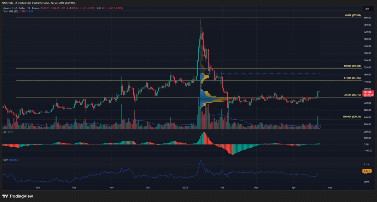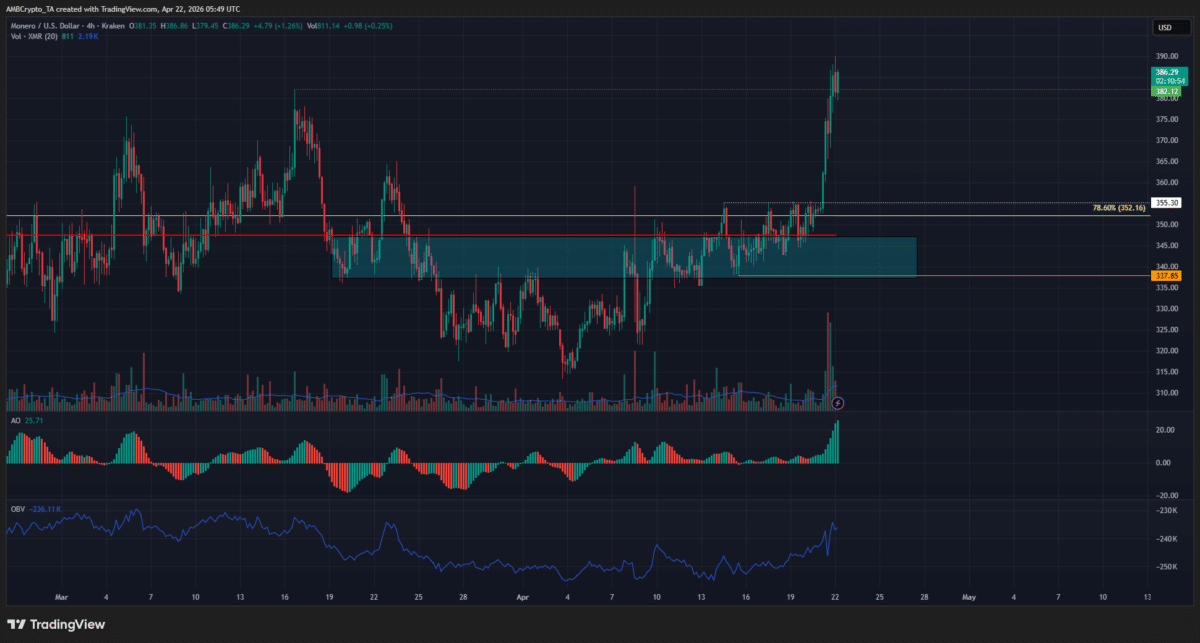 In the past 24 hours, $XMR has registered 8.49% in gains. Interestingly, this rally saw the privacy token clear the $352 local resistance for the first time in April.
