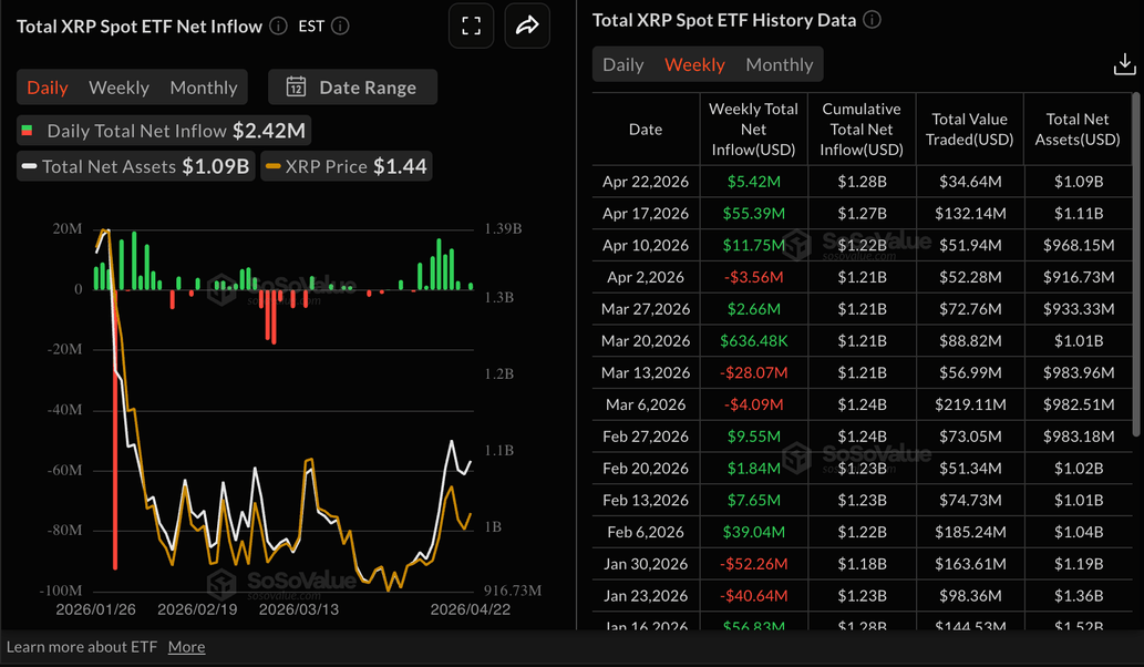 Inflows totaled $2.42 million on Wednesday, following muted activity the previous day. Meanwhile, cumulative inflows average $1.28 billion and total net assets $1.09 billion, according to SoSoValue data. Steady institutional demand is required to help shape sentiment and sustain $XRP’s recovery.