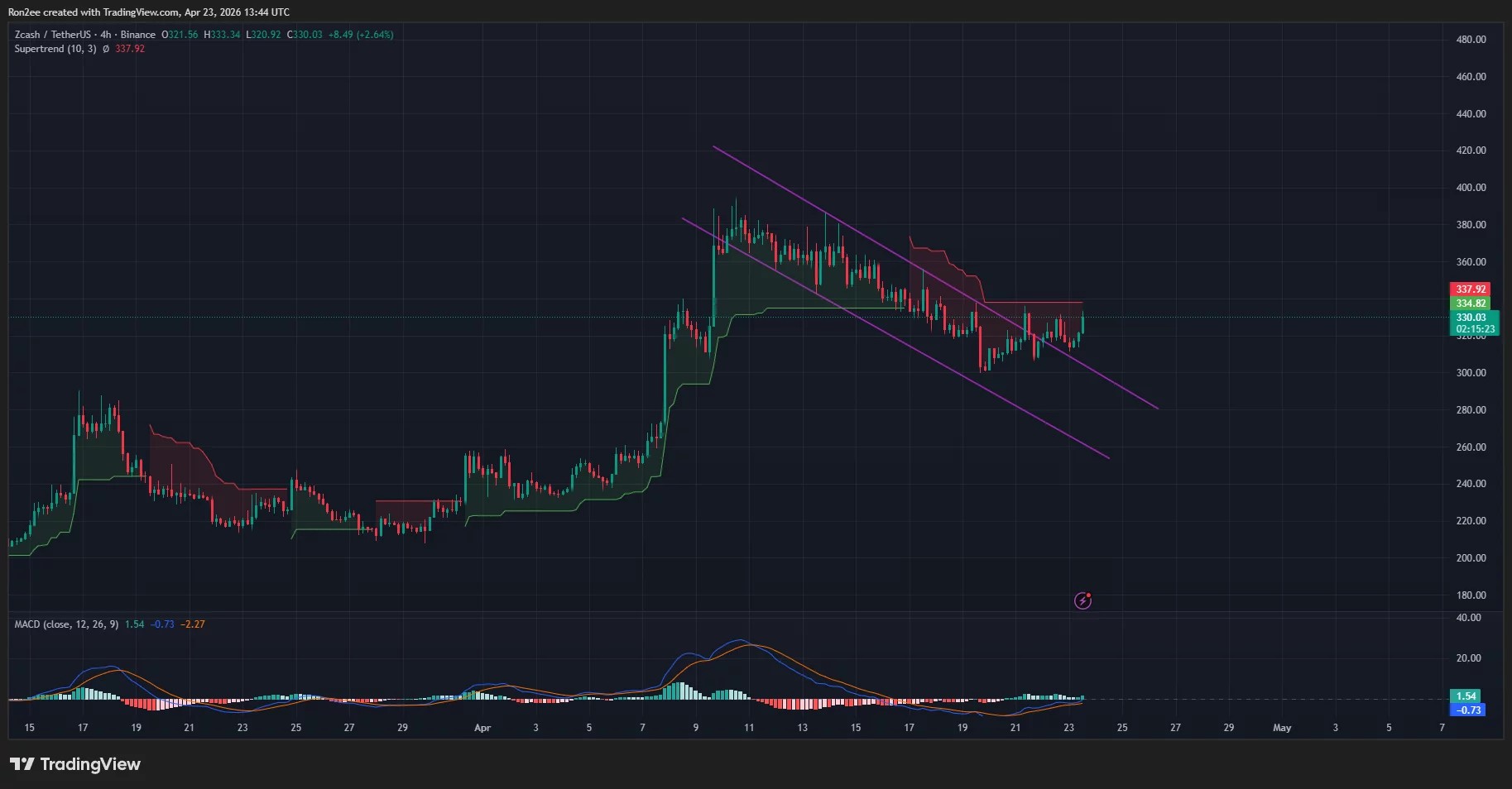 Zcash price rose around 3% on Thursday, holding above the $330 level after breaking out of a descending channel pattern.