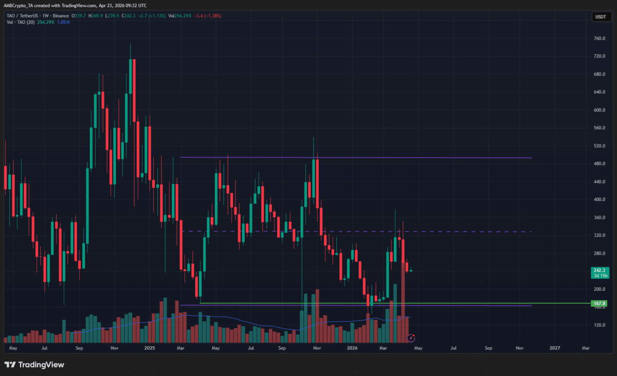 On the 1-week chart, Bittensor lacked a clear direction. It saw sizeable losses early in 2025, but has traded within a range from $163 to $493 since then.