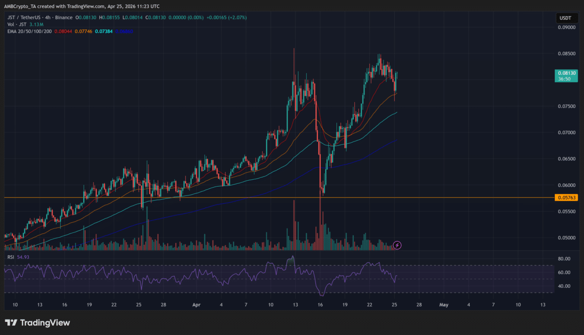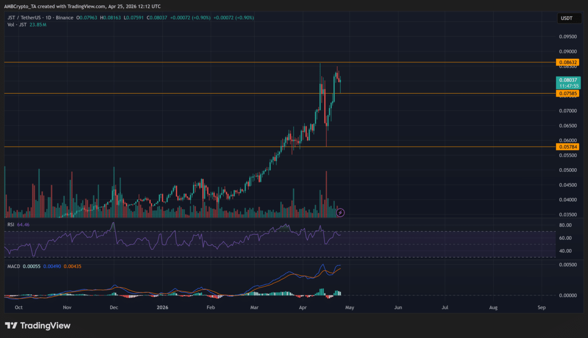 $JST’s rally began to settle as the price stabilized near $0.080 after failing to hold the $0.086 high. This shift hinted at profit-taking following the mid-April burn, where over 271 million $JST tokens were removed.