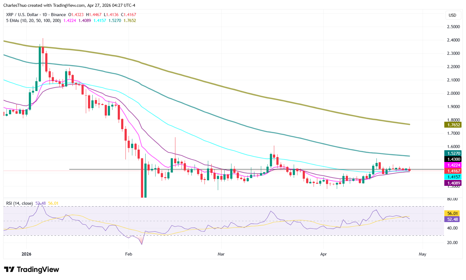 While some projections extend higher into future cycles, current price action remains firmly in a consolidation phase with the next breakout direction dependent on whether buyers can reclaim resistance at $1.43 or whether sellers force a breakdown below $1.40.