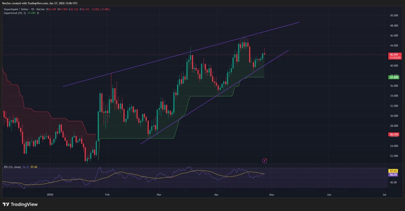 According to data from crypto.news, Hyperliquid ($HYPE) price rose from a $39 low on Wednesday last week to an intraday high of $43 before stabilizing at $42 and establishing $40 as a firm support floor.