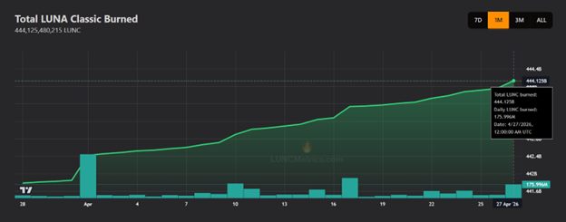 Nearly 176 million $LUNC tokens were removed from circulation on April 27 alone, according to LUNCMetrics data, adding a supply-reduction narrative that traders have closely followed.