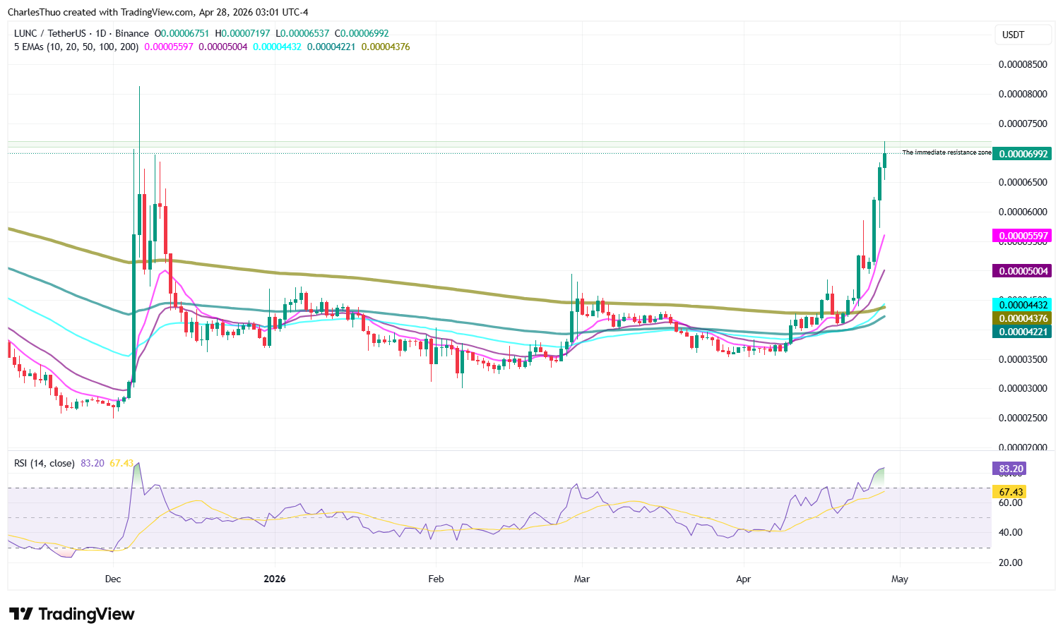 But momentum indicators tell a more cautious story, with the Relative Strength Index (RSI) sitting above 83.20 on the daily chart, and at 70.67 on the weekly chart, placing $LUNC firmly in overbought territory, a condition that often precedes a pause or short-term pullback.