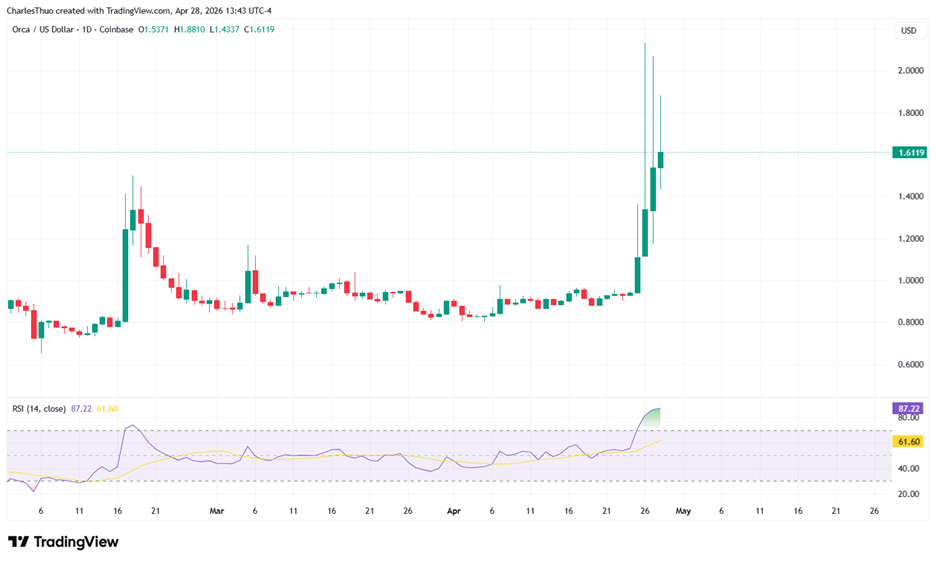 The latest move in $ORCA comes after a rapid expansion phase that saw the token rise by roughly 108% over a one-week period before reaching highs near $1.90.