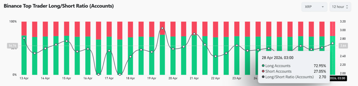 Binance data showed that top traders maintained a strong long bias, with 72.95% of accounts positioned long compared to 27.05% short. This imbalance pushed the Long/Short ratio to 2.70, highlighting a crowded directional bet toward upside continuation.