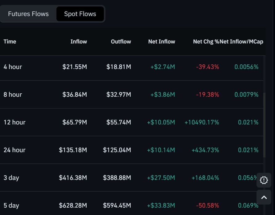 At press time, for instance, the altcoin recorded a spot inflow of $135.1 million, while inflows dipped to $125 million.