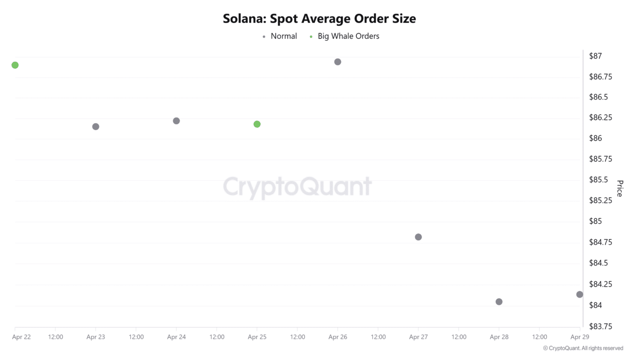 This metric showed whale orders appeared only once in the past seven days, indicating whales are increasingly bearish.