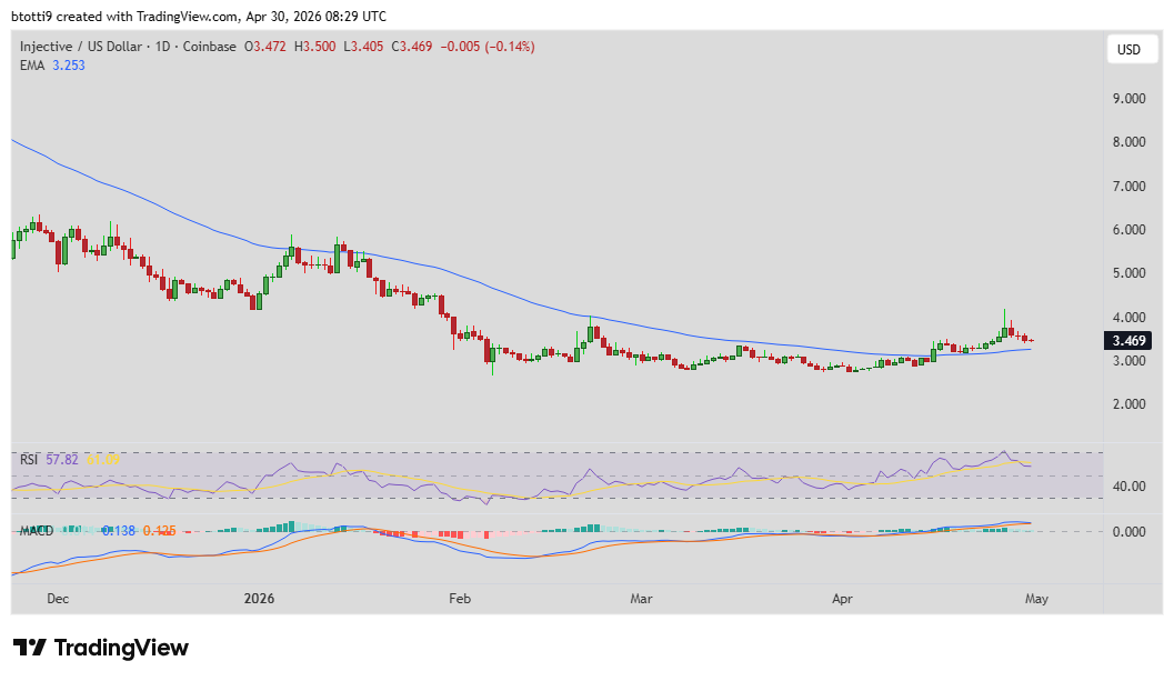 Injective price is down nearly 5% in the past 24 hours, extending recent losses to $3.40 after bulls ran into resistance at the $4.00 mark.