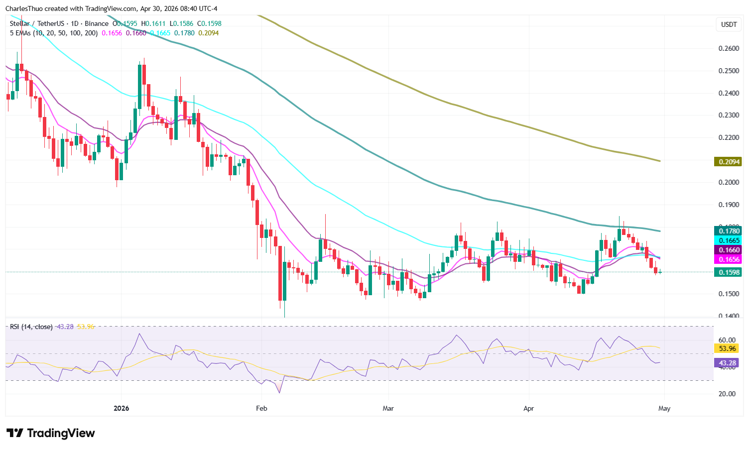 From a technical standpoint, Stellar is still trading below all major exponential moving averages, including the 50-day, 100-day, and 200-day EMAs, which are clustered between approximately $0.166 and $0.209.