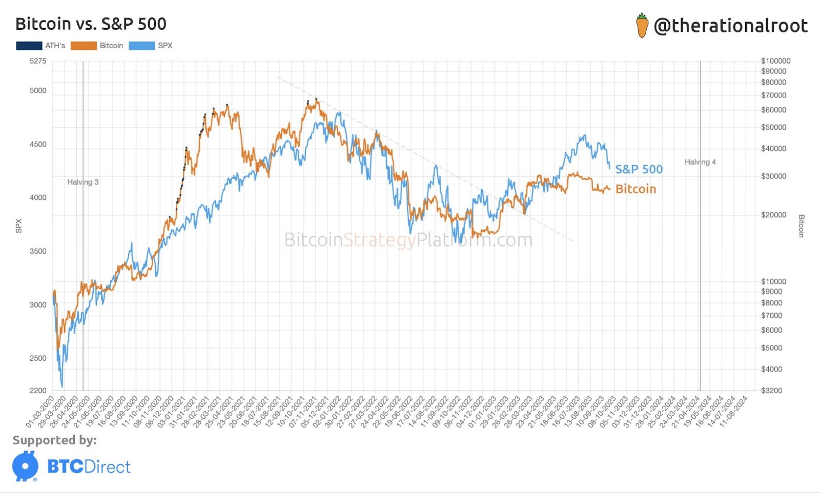 Well-known cryptocurrency market analyst @therationalroot recently published a chart of the two assets on X. It clearly shows that the S&P 500 (blue) and Bitcoin (orange) seem to be moving very close since 2020.