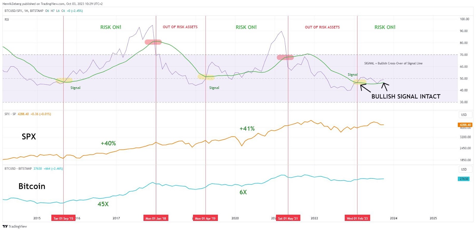According to the analyst, confirmation of the bull market and the “risk on” period was the upward crossing of the signal line (green) by the monthly RSI indicator for the BTC/SPX pair.