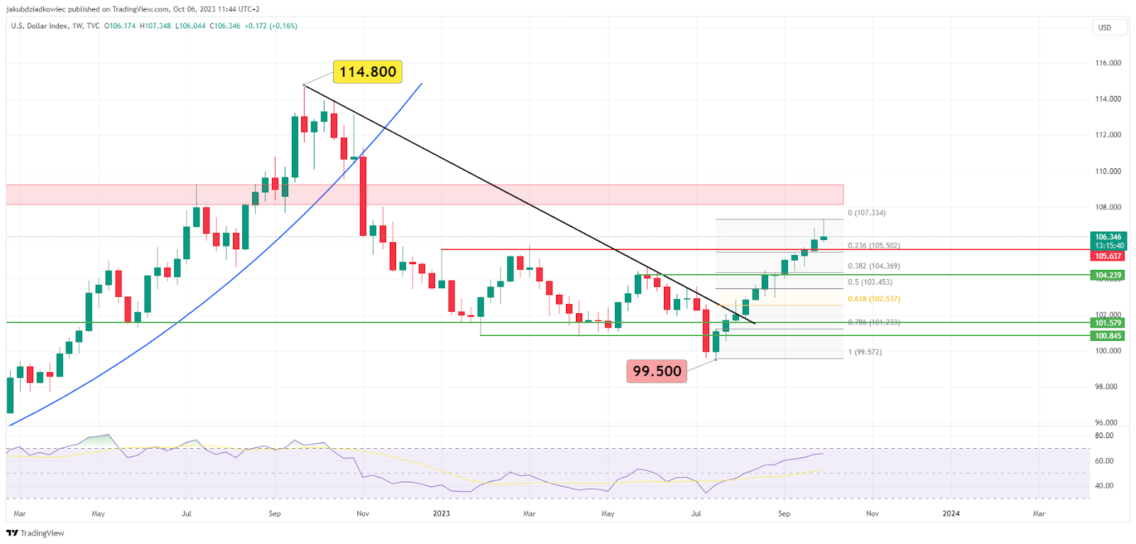 If this happens, the nearest support level for the DXY is in the 104 area, which remains in confluence with the 0.382 Fib retracement level of the entire upward movement. On the other hand, the continuation of the uptrend may lead the DXY to the next area of resistance in the 108-109 range (red rectangle).