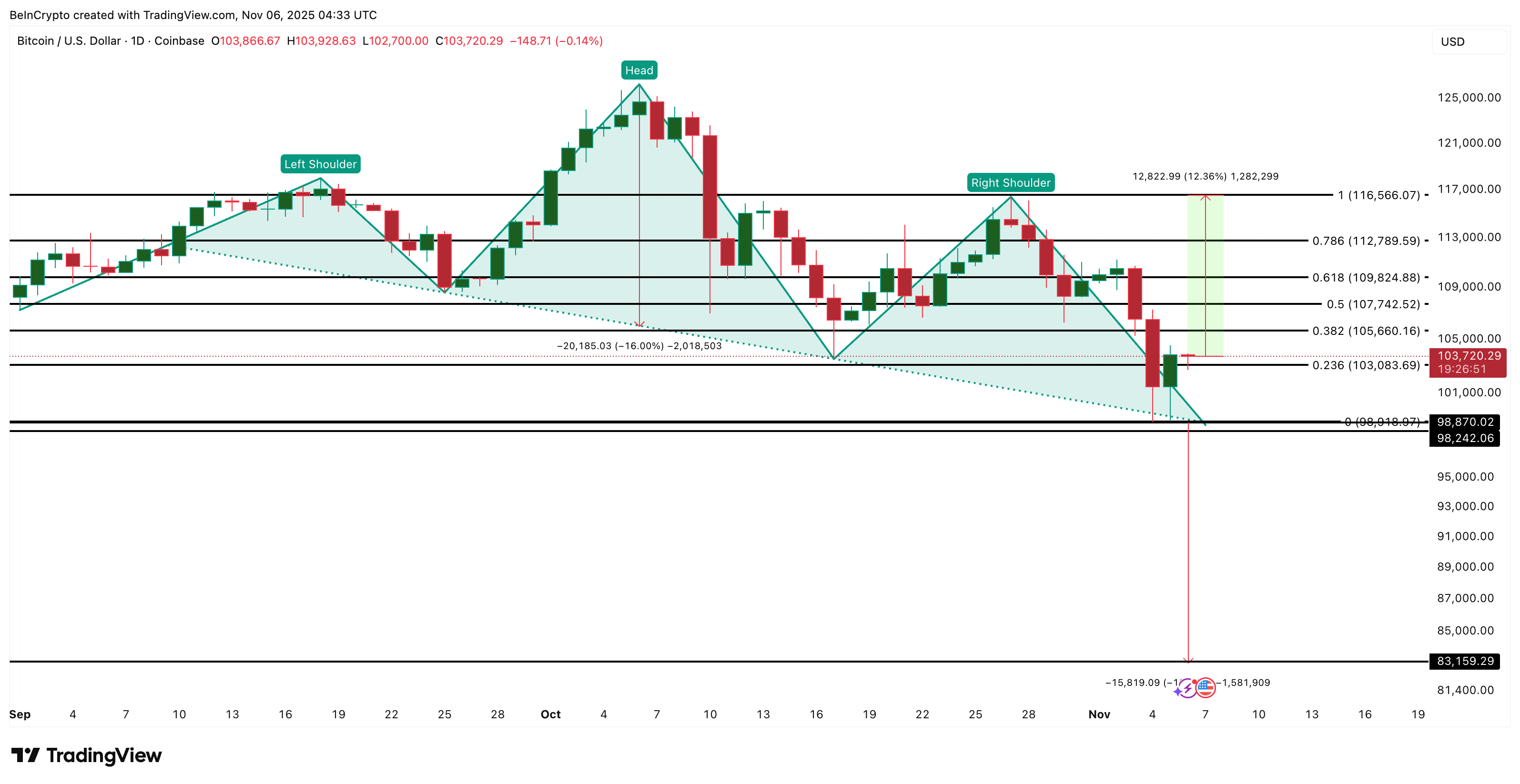 However, if $103,000 fails, Bitcoin risks revisiting $98,900. A daily close under that would trigger a neckline breakdown. And that could push the BTC price toward $83,100, the pattern’s projected downside target.