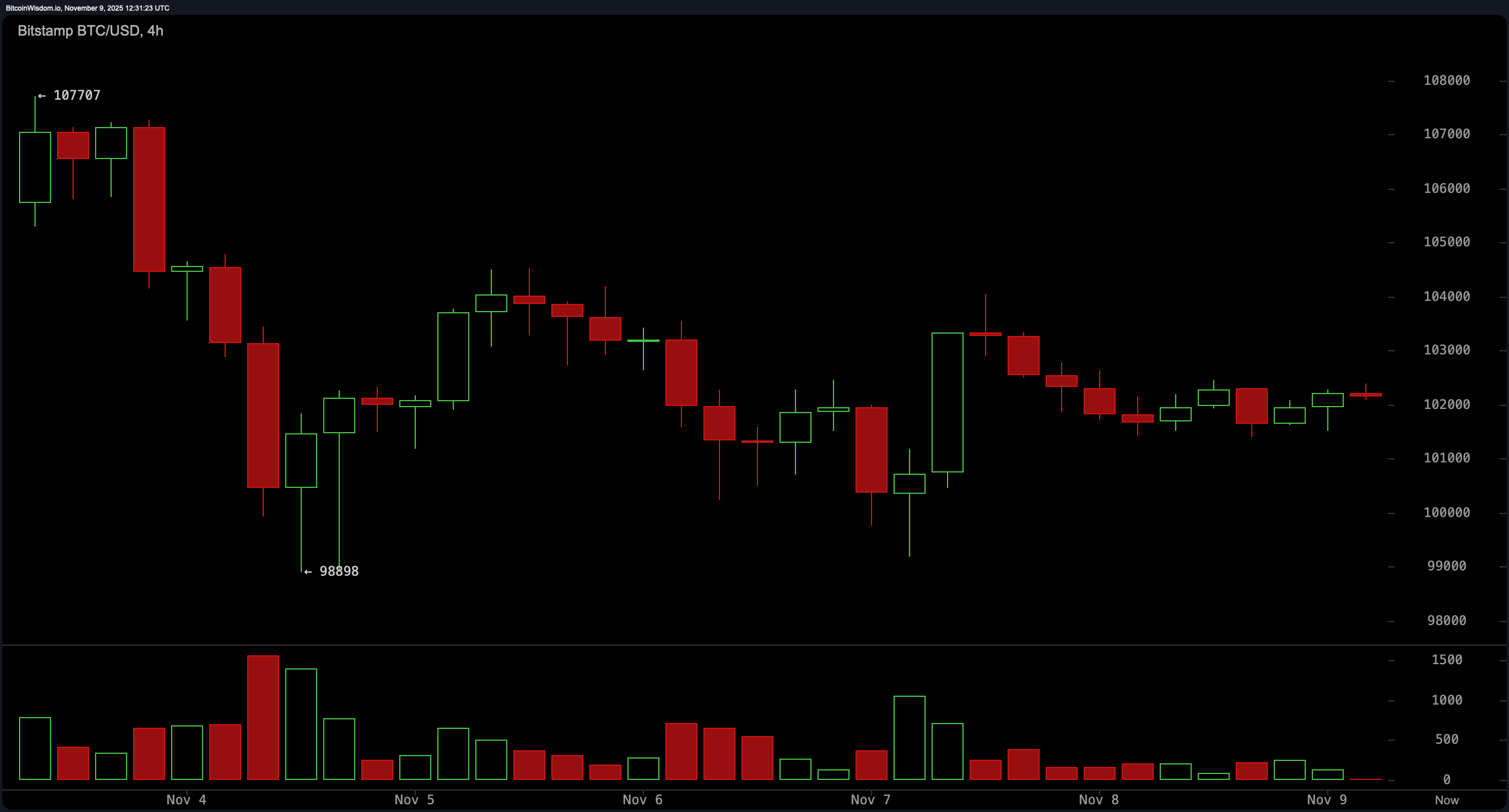 Zooming into the 4-hour chart, things aren’t looking much cheerier. The modest recovery following the drop has lost steam, with lower highs forming like a sad staircase going nowhere. The declining volume on upward price moves tells the tale—buyers are tapping out early. Resistance between $103,000 and $104,000 is acting like a bouncer at an exclusive club, and support around $101,000 is thin at best. The market is coasting in neutral, and unless something sparks momentum, bitcoin risks drifting into another leg downward.