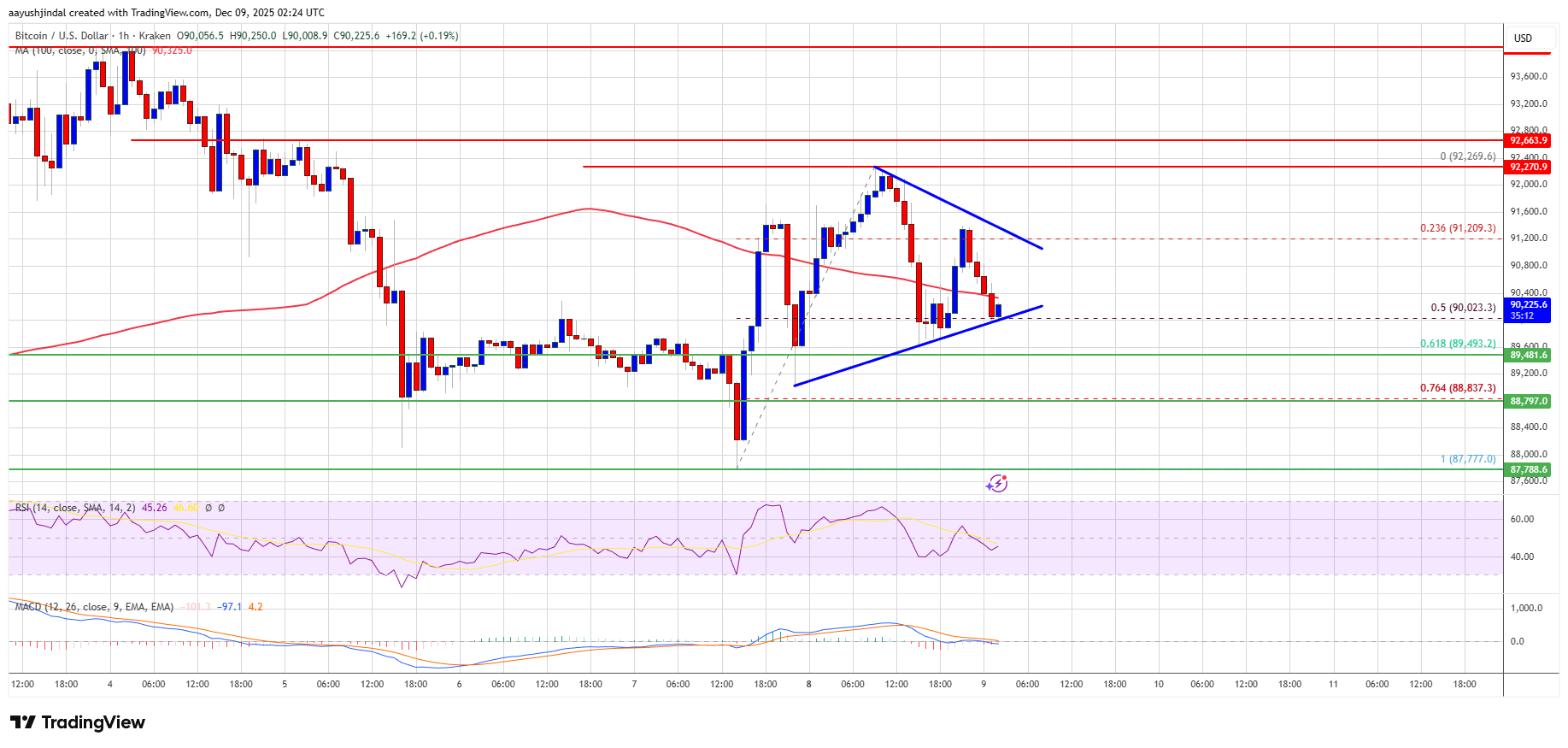 However, the bulls were active near the $90,000 support. Bitcoin is now trading below $90,000 and the 100 hourly Simple moving average. Besides, there is a contracting triangle forming with support at $90,000 on the hourly chart of the BTC/USD pair.
