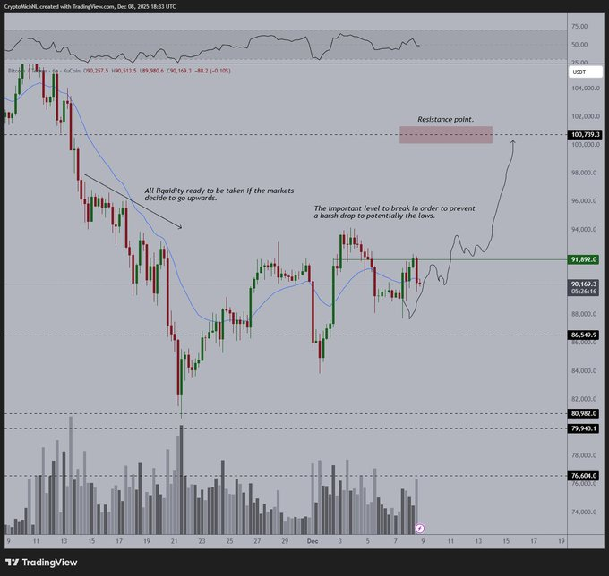 Another analyst, Michaël van de Poppe, noted in a December 8 X post that Bitcoin is nearing a decisive point, with $92,000 emerging as the key level that will determine whether the market stabilizes or slips into a deeper correction.