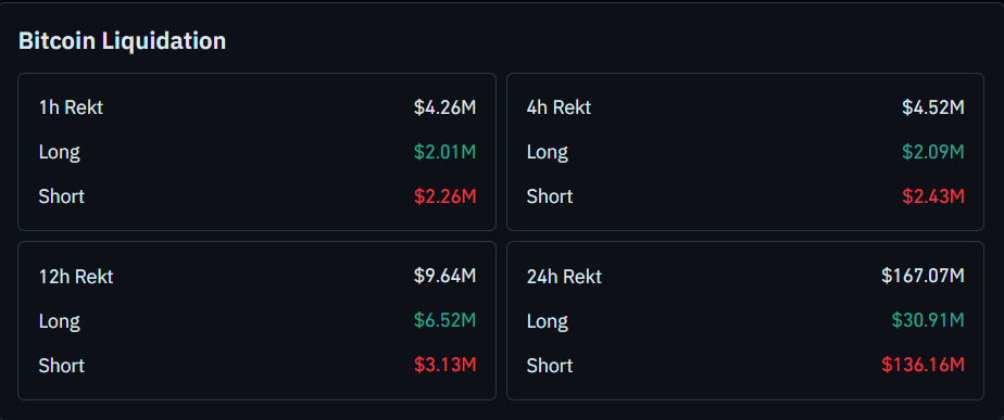 The most significant data comes from the 24-hour liquidation figures, with a staggering $167.07 million in total liquidations. A major portion of this, $136.16 million, comes from short positions.