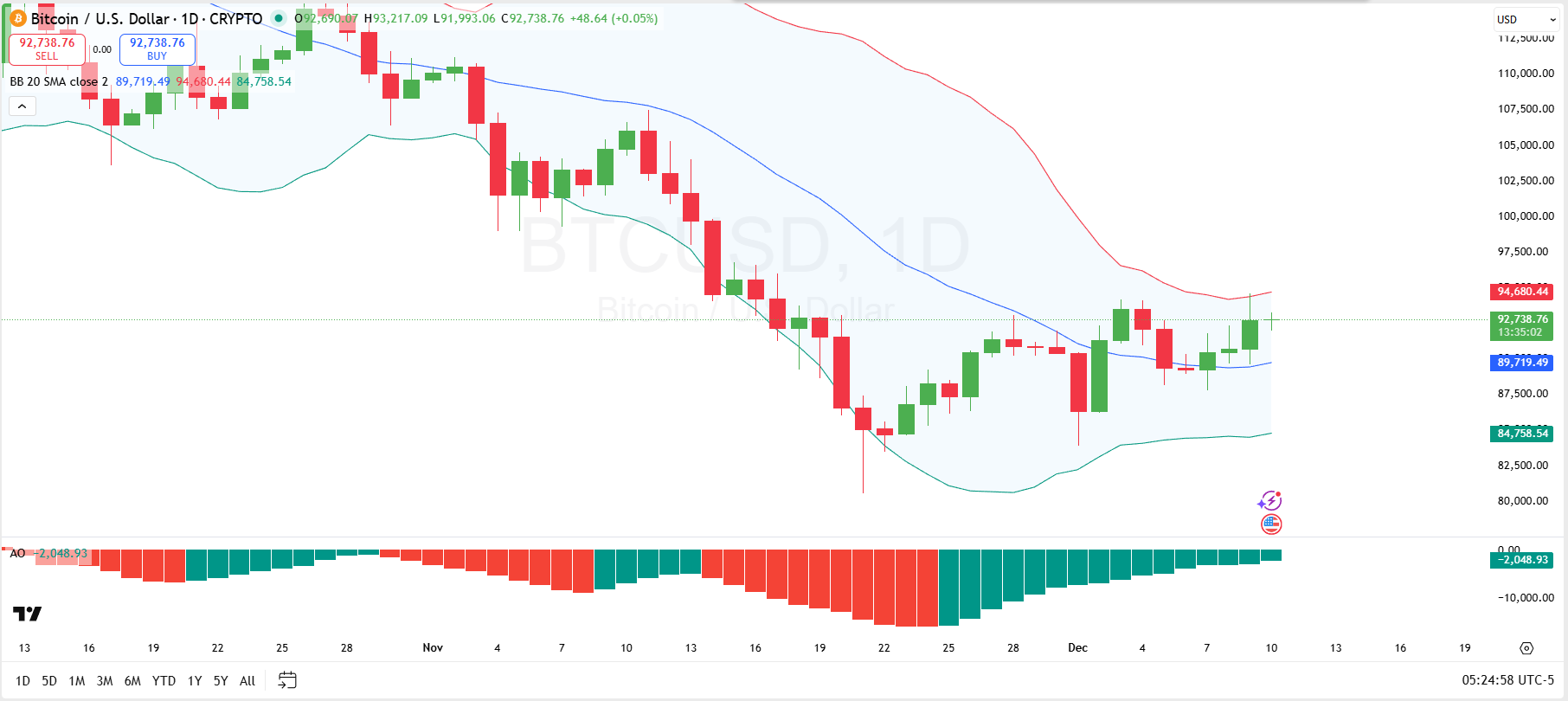 On the technical end, the price currently sits above the middle band of the Bollinger Bands indicator, with the upper band at $94,680.44 and the lower band at $84,758.54. BTC recently tested the upper, creating a potential resistance zone, but has since retraced towards the middle of the band based at $89,758.