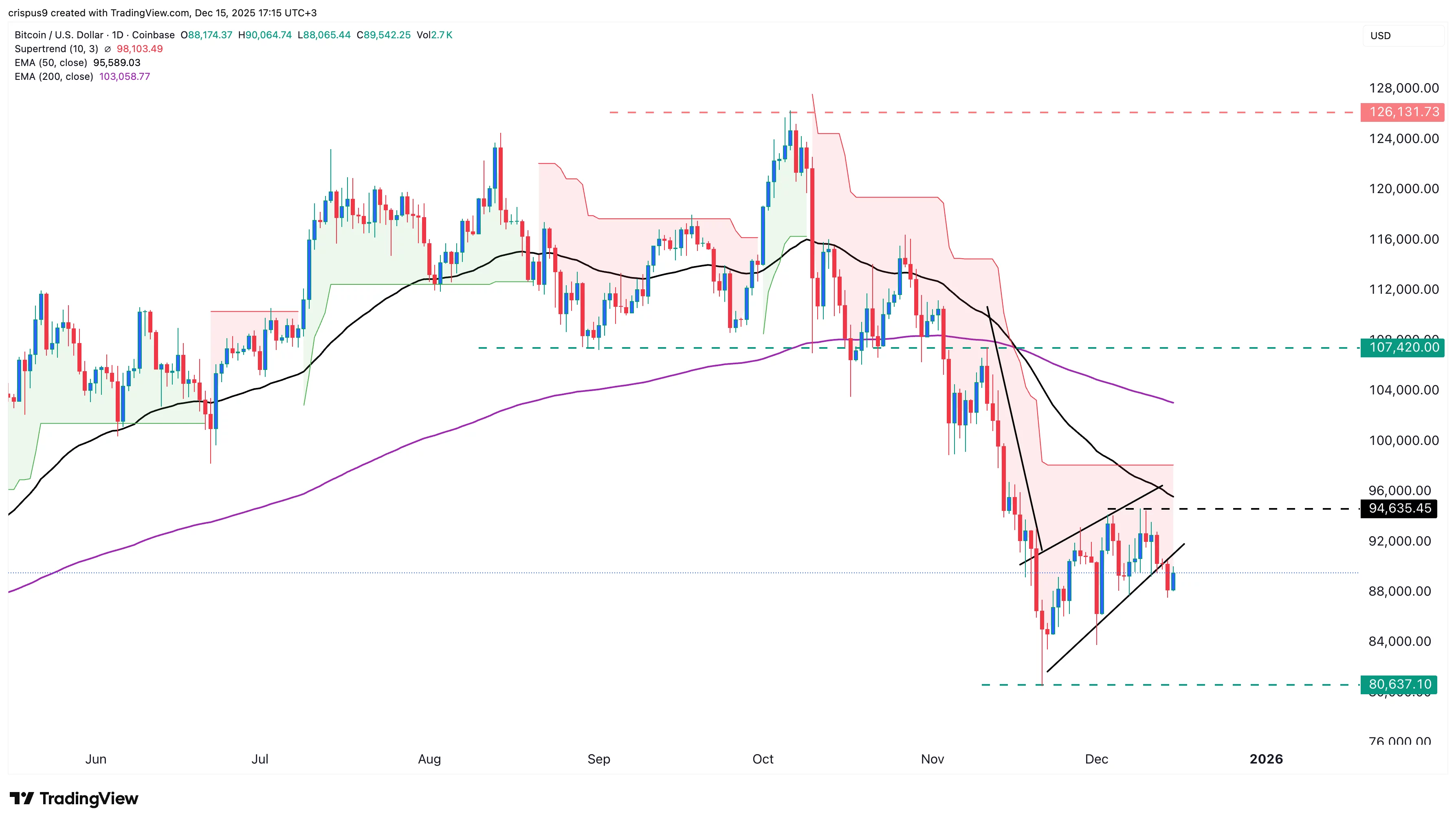 The BTC price is also at a significant risk of further downside in the near term. The daily chart indicates that it has formed a rising wedge pattern, a bearish flag pattern.