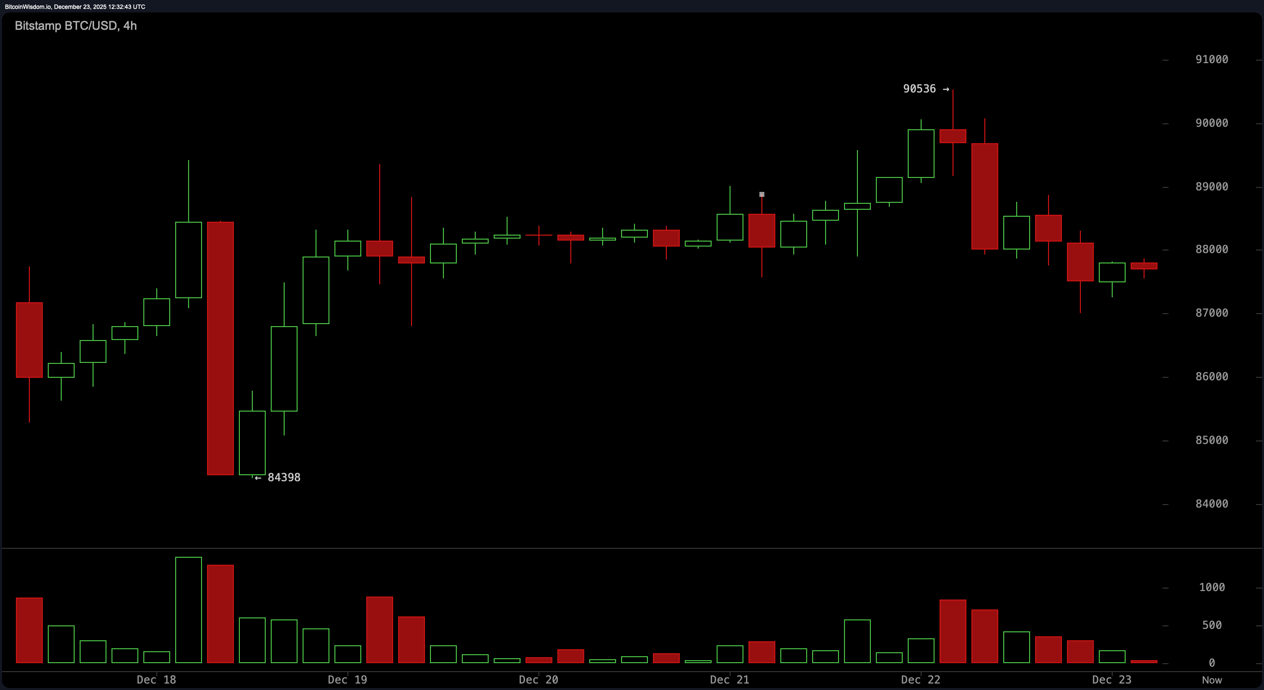 On the 4-hour chart, bitcoin’s most recent performance resembles a failed attempt at a breakout followed by a “we tried” pullback. The price peaked at $90,536 and gracefully slid into a series of lower highs and lower lows, shedding enthusiasm but not collapsing in despair. Volume metrics show a burst of sell pressure followed by a tapering off — a classic sign of seller fatigue rather than all-out liquidation. Key support at $87,500–$88,000 is holding firm, and with resistance set at $89,800–$90,500, this setup smells more like a pause than a pivot.
